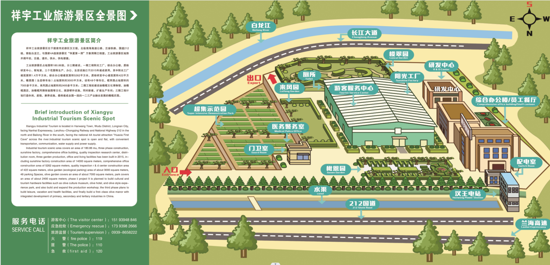 橄恩園、欖萃園、來鳳園(三處各具特色的油橄欖園林景觀);三中心即游客服務(wù)中心(為旅游者提供各項服務(wù))、