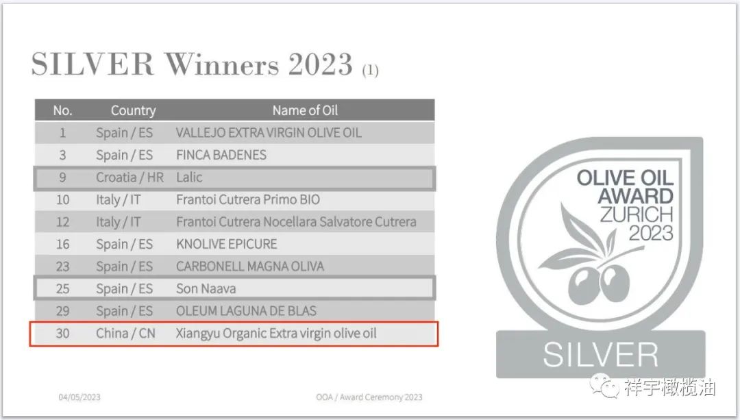 祥宇選送的特級初榨橄欖油在10個國家126個樣品中獲得1銀1銅的好成績。
